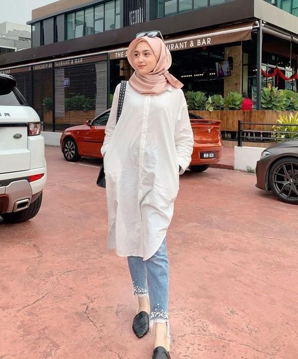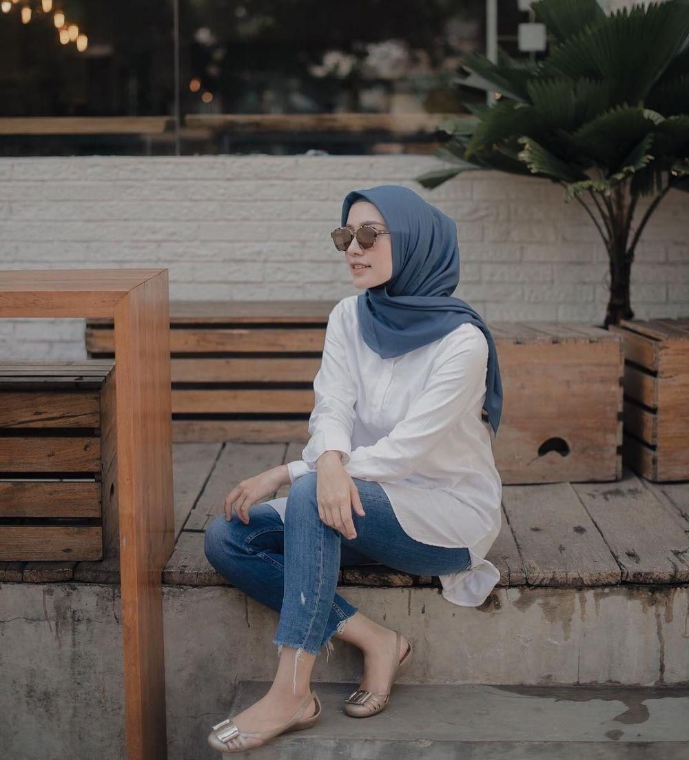 Baju Tunik Putih dan Skinny Unfinished Jeans Berbeda dari gaya sebelumnya yang ceria, kombinasi ini menawarkan kesan yang lebih elegan dengan permainan warna biru dan putih. Warna biru hadir dari hijab dan skinny unfinished jeans. Atasan tunik putih yang panjang hingga paha melengkapi penampilan ini. Tambahkan aksesori seperti flat shoes berwarna netral dan kacamata hitam untuk kesan yang lebih sempurna.