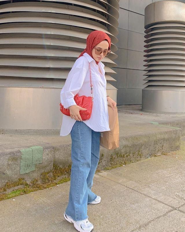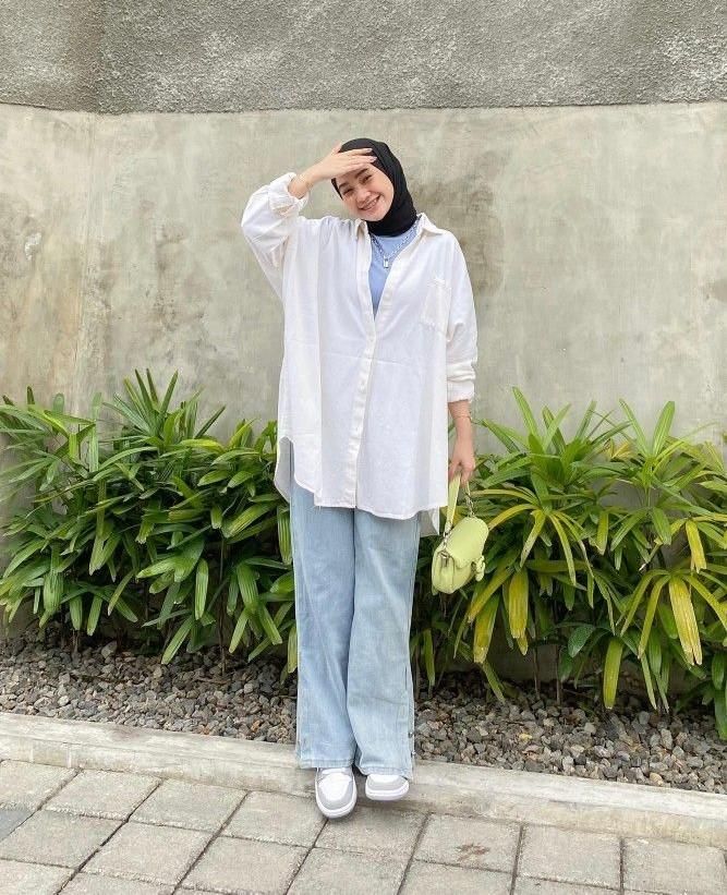 Kemeja Oversized Putih dan Baggy Jeans Gaya kasual lainnya hadir dari perpaduan kemeja putih oversized dengan bawahan baggy jeans. Kombinasi ini cocok untuk berbagai kesempatan. Tambahkan aksesori seperti hand bag dan sepatu sneakers dengan warna senada. Hijab hitam yang netral juga bisa menjadi pilihan yang menarik.