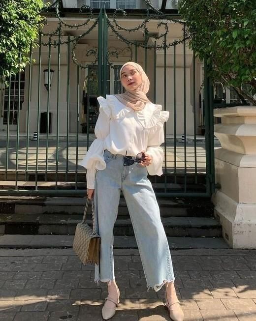 Blouse Ruffle Putih dan Kulot Jeans Tunjukkan sisi feminin lainnya dengan blouse putih berdetail ruffle pada lengan dan pinggang. Padukan dengan celana kulot jeans yang lebar dan nyaman. Hijab pashmina putih dan sepatu sneakers putih akan menjadi aksesori yang sempurna untuk melengkapi gaya ini.