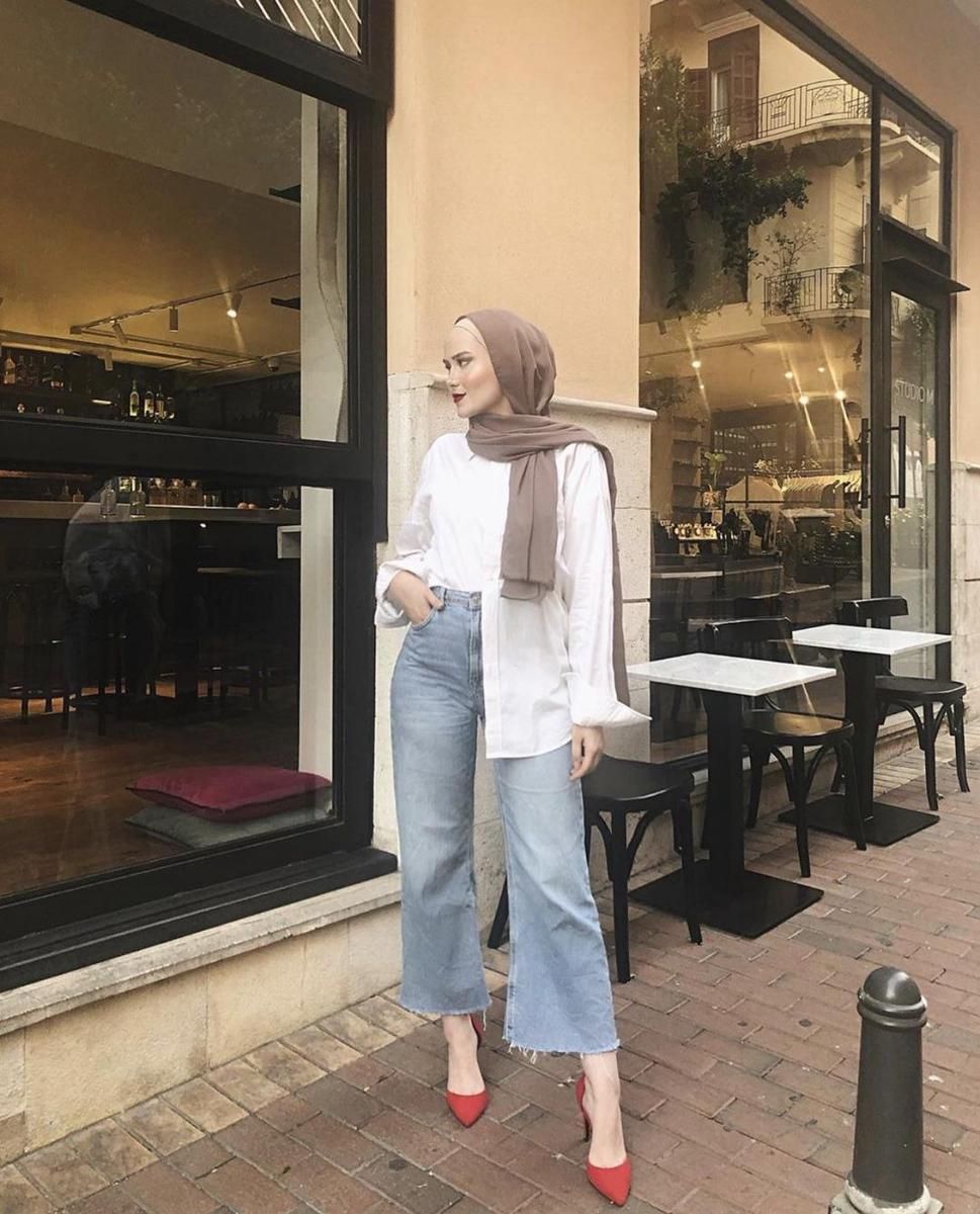 Kemeja Putih dan Unfinished Flared Jeans Kesan glamor dapat diciptakan dengan penggunaan aksesori seperti sepatu stiletto merah yang mencolok. Namun, dasar dari kombinasi ini cukup simpel: kemeja putih yang dimasukkan sebagian ke dalam flared jeans yang melebar di bagian bawah. Padukan dengan hijab pashmina berwarna kalem seperti cokelat atau krem untuk tampilan yang lebih santai namun tetap berkelas.