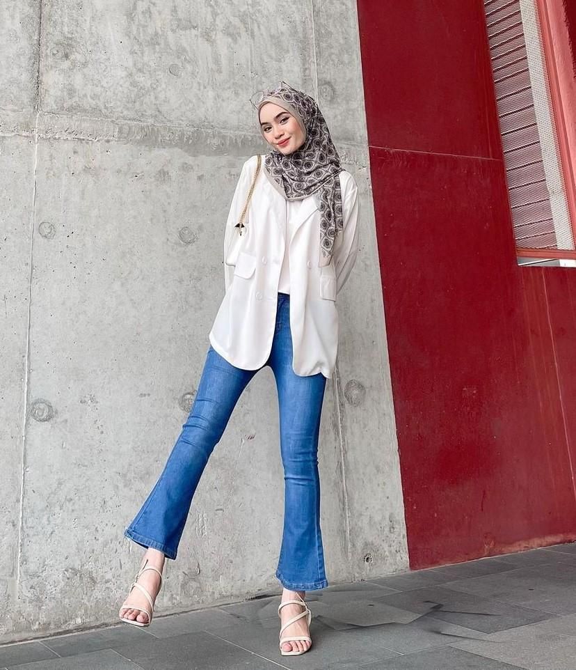 Blazer Putih dan Boot Cut Jeans Untuk tampilan yang lebih formal, kombinasi blazer putih dan boot cut jeans adalah pilihan yang ideal. Celana dengan potongan ketat di paha dan melebar di bagian bawah ini memberikan siluet yang menarik. Gunakan dalaman putih dan blazer senada untuk kesan formal. Padukan dengan hijab bermotif dan sepatu high heels putih. Gaya ini sangat cocok untuk ke kantor atau acara semi-formal.